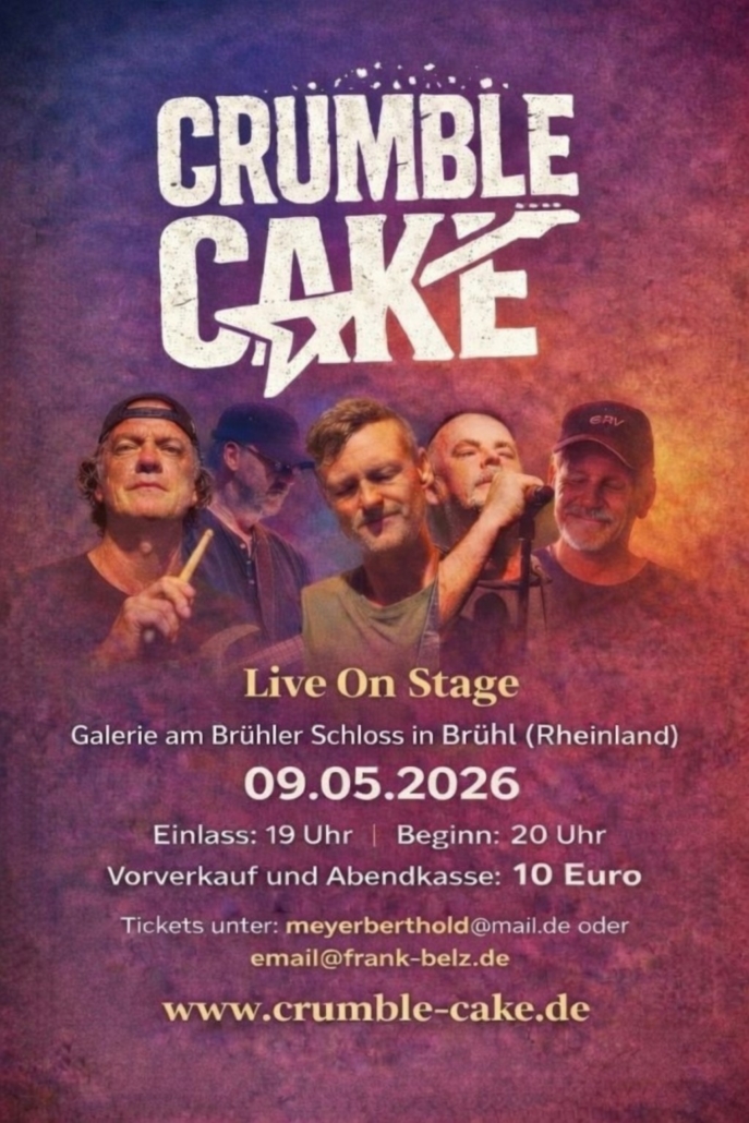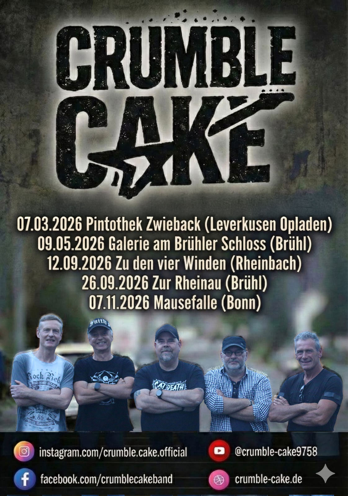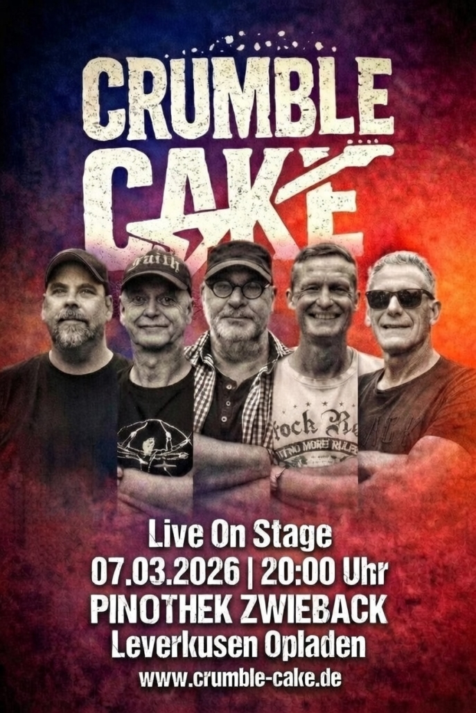 Die Jungs von Crumble-Cake (teilweise seit über 40 Jahren musikalisch in verschieden Bands und semiprofessionell unterwegs) spielen ausschließlich eigene Lieder, die in den Bereichen von Rock, Hard Rock und gefühlvolle Balladen angesiedelt sind. Dabei auch mehrstimmiger Gesang und harmonisch aufgelöst, teilweise als Hymnen und anregend zum mitsingen. Die Band hat einen eigenen Sound und Stil, nie langweilig und immer mit Druck und Dynamik.